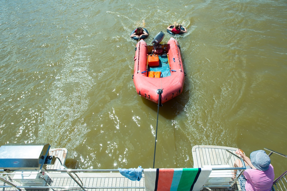 With a river as long as the Hawkesbury the tide peaks at different times. Each cycle lasts just over 6 hours but if you time it right you can stay in the flow for much longer. I was keen to do this but with youngsters onboard there’s a need to have fun. So pleased we have the rubber duck. In this way the Mothership becomes at true mothership as the young go off and discover crabs on the mud or in this case a ‘bunch’ of jelly fish. I don’t know what the collective noun for jellyfish is.