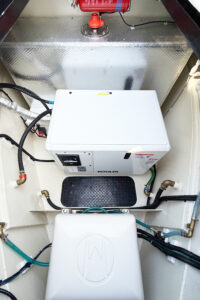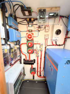Each boat we build is different and this one is no exception, go down the steps into the accommodation and you’ll find electrical and battery cupboards left and right. A little further on and there’s the guest toilet/cloakroom portside and starboard side, washer dryer and extra cupboard space.