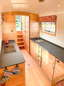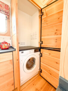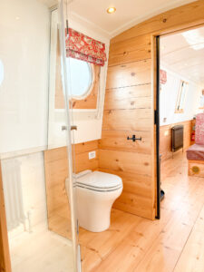 Moving further forward is the snug with an L-shaped built in sofa and storage underneath. Every boater needs a bookshelf for their Nickleson guides and we’ve put one at the end of the sofa. However this one’s different in that remove the arm, take away the board and the sofa extends nearly a foot more should a long person be using this space as a bed, perfect for luxury sustainable living on electric narrowboat.