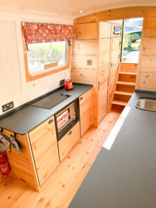 Galleys on boats are tiny but to help movement of people and to be more comfortable to work in we make ours with a 800mm corridor in the middle. It means less room on the starboard cupboards, so inevitably less storage space. A problem if you want six months of food stored in cans for a nuclear war, not so much if you live off mostly fresh foods. Supermarkets are in abundance along the canals and you’re sure to come across one every three days.