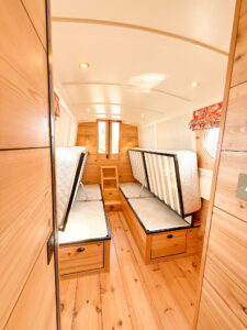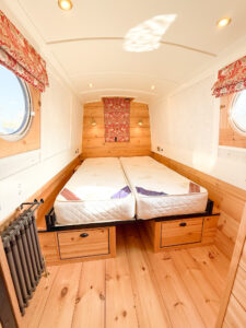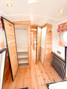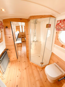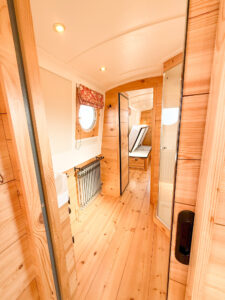 The warmth of the teak deck and the ample space on the stern of Sunbeam make this boat ideal for couples and groups. Conversation is easy without raising their voice thanks to a very quiet electric motor. It’s another example of luxury sustainable living on an electric narrowboat.